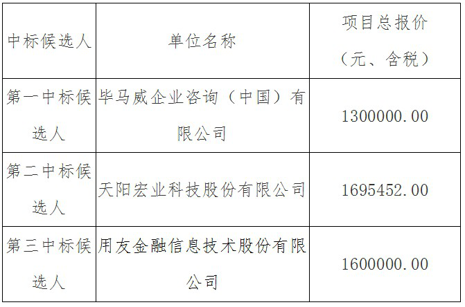 沧州银行金融资产减值估值系统建设项目(沧银招“CZYHZB202307001”号)采用邀请招标方式进行评标。现就本次招标的中标候选人名单予以公示,具体如下: